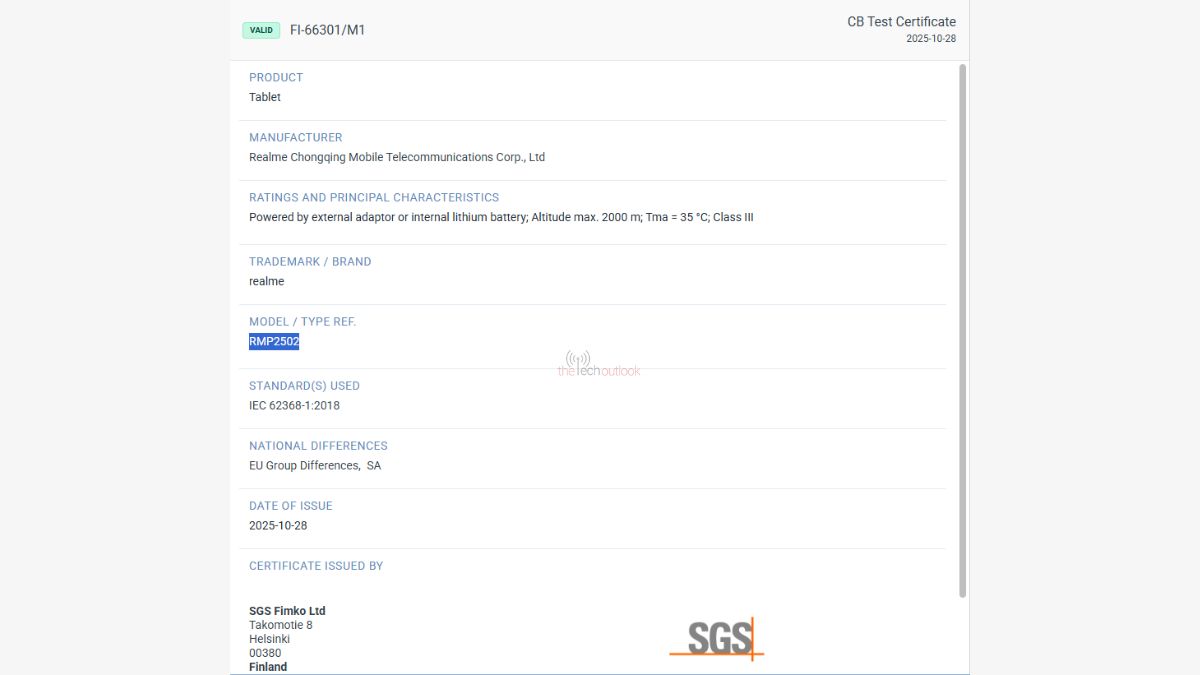 Today, our team at The Tech Outlook has spotted a new Realme tablet with model number RMP2502 on the SGS certification website.