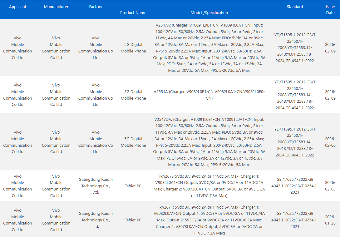 Coming to the Vivo/iQOO tablets, the devices were spotted with power adapters carrying model numbers V9082L0A1-CN and V8073L0A1-CN, suggesting 80/90W wired fast charging. The tablets are expected to feature a 13-inch display and be powered by the Snapdragon 8 Elite Gen 5 SoC.