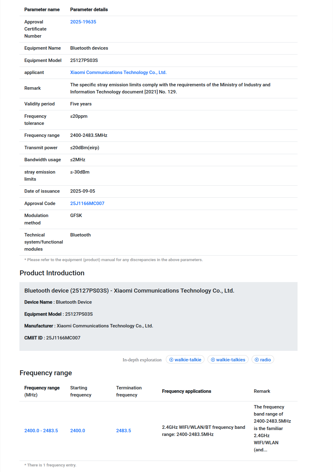 Specs such as ≤20ppm frequency tolerance, 2400-2483.5MHz frequency range, ≤20dBm(eirp) transmit power, ≤2MHz bandwidth usage, ≤-30dBm stray emission limits, and GFSK Bluetooth modulation type have been revealed for the device.