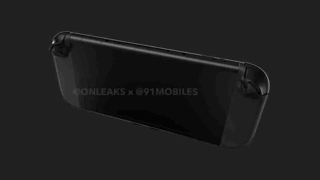 At the bottom there is a central dack flanked by two guide pins while there are also two openings towards the sides that could be the speakers. On the back, there is a U- shaped back stand that will be used in tabletop mode. This is an improvement over the Nintendo Switch OLED.