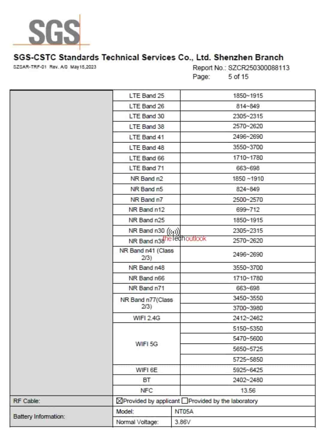 On the connectivity side, the upcoming smartphone is revealed with specs such as 5G/4G/3G/2G network, WiFi 6E with triple band support, Bluetooth, and NFC. A Li-ion battery with the model number – ‘NT05A’ will also be present inside, and this is mentioned to offer a rated battery capacity of 5150 mAh. Additionally, the charging adapter with model number – ‘C286’ and a USB Type-C to Type-C 1m shielded cable have also been listed along with this smartphone. Up to 65W wired fast charging capability can be expected on the device as per FCC.