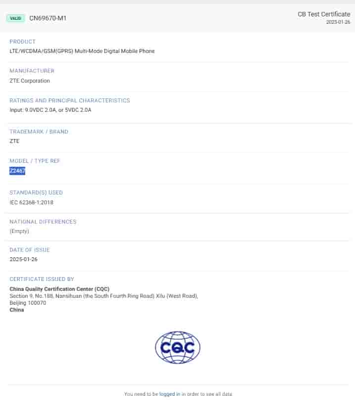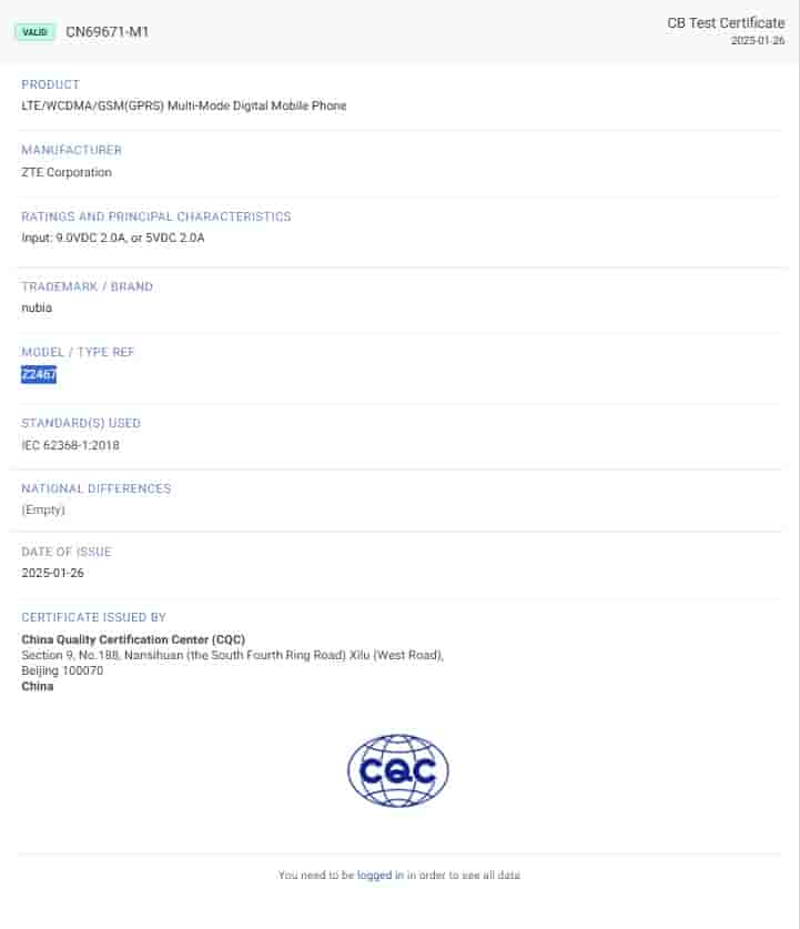 The Nubia V70 Max smartphone with the model number – ‘Z2467’ has received the CQC certification with the certificate numbers – ‘CN69670-M1’ and ‘CN69671-M1’, and has been listed as a ‘LTE/WCDMA/GSM(GPRS) multi-mode digital mobile phone’. Its input charging capacity is revealed to be ‘9.0 VDC 2.0A or 5 VDC 2.0A’.