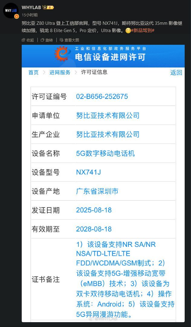 Nubia Z80 Ultra (NX741J) – 3C and MIIT Certifications