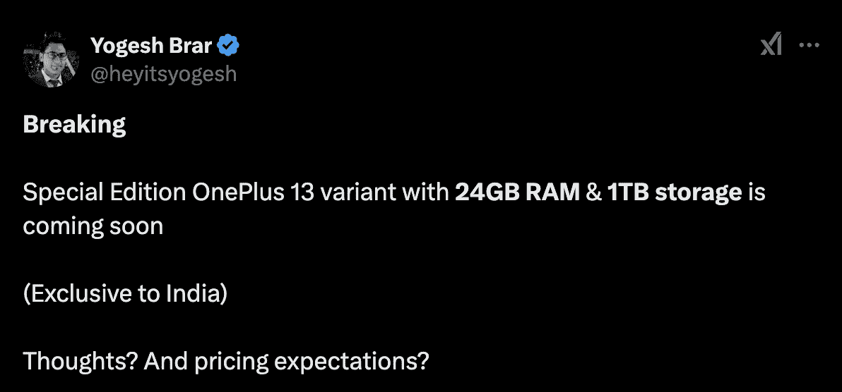 And now it looks like there will also be a special edition of this smartphone that will be launched. As per the tipster Yogesh Brar, who shared on X that OnePlus will launch a special edition of the OnePlus 13 with 24GB RAM and 1TB of internal storage.