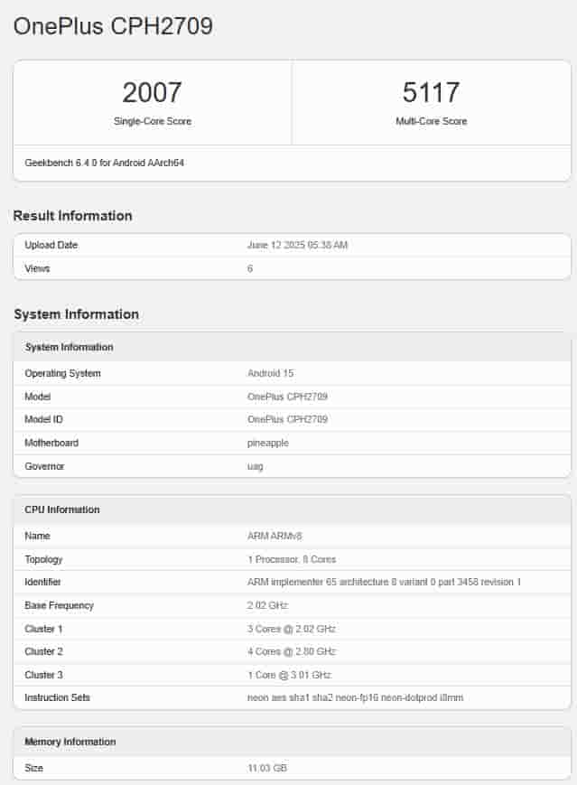 The OnePlus Nord 5 smartphone global variant carrying the model number of ‘CPH2709’ has attained single-core and multi-core performance scores of 2007 points and 5117 points respectively on Geekbench. On the other hand, the OnePlus Nord CE 5 smartphone’s global variant which bears the model number of ‘CPH2719’ has scored 1321 points and 4082 points respectively on the single-core and multi-core Geekbench tests.