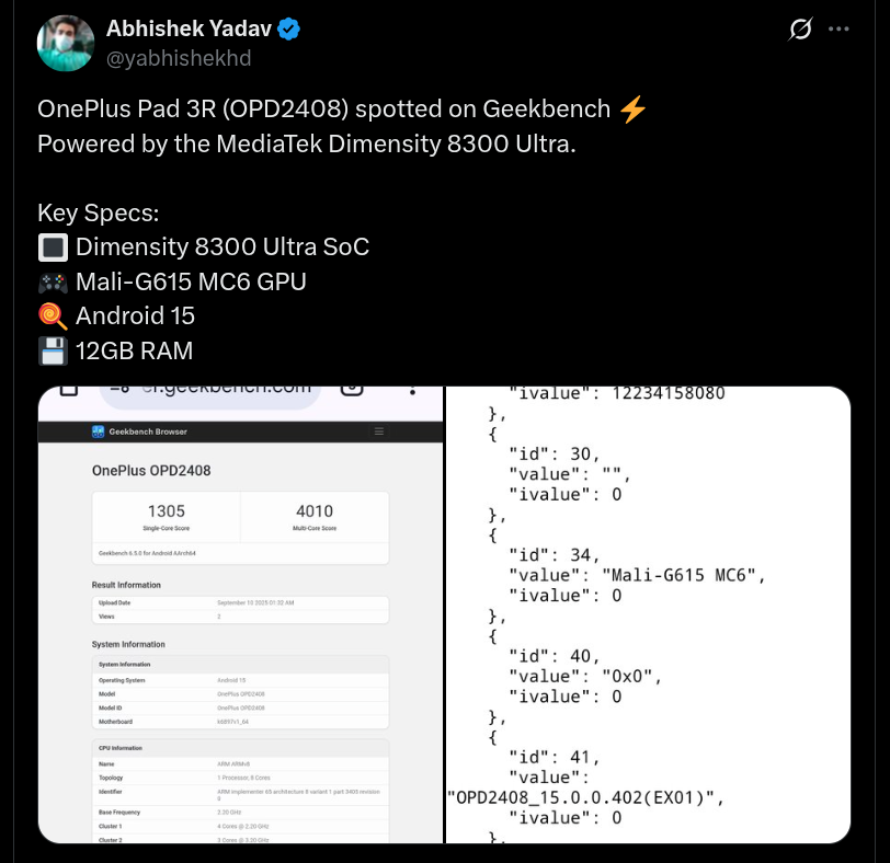 OnePlus’ Pad 3R tablet which carries the model number of ‘OPD2408’ has been listed on the Geekbench database, and it has achieved 1305 points and 4010 points respectively in the single-core and multi-core tests. The 12GB RAM variant of the upcoming device has been spotted on Geekbench, and specs such as the 3.35GHz-clocked MediaTek Dimensity 8300 Ultra octa-core chip, ARM Mali G615 MC6 GPU, and Android 15 operating system have been revealed for the device.