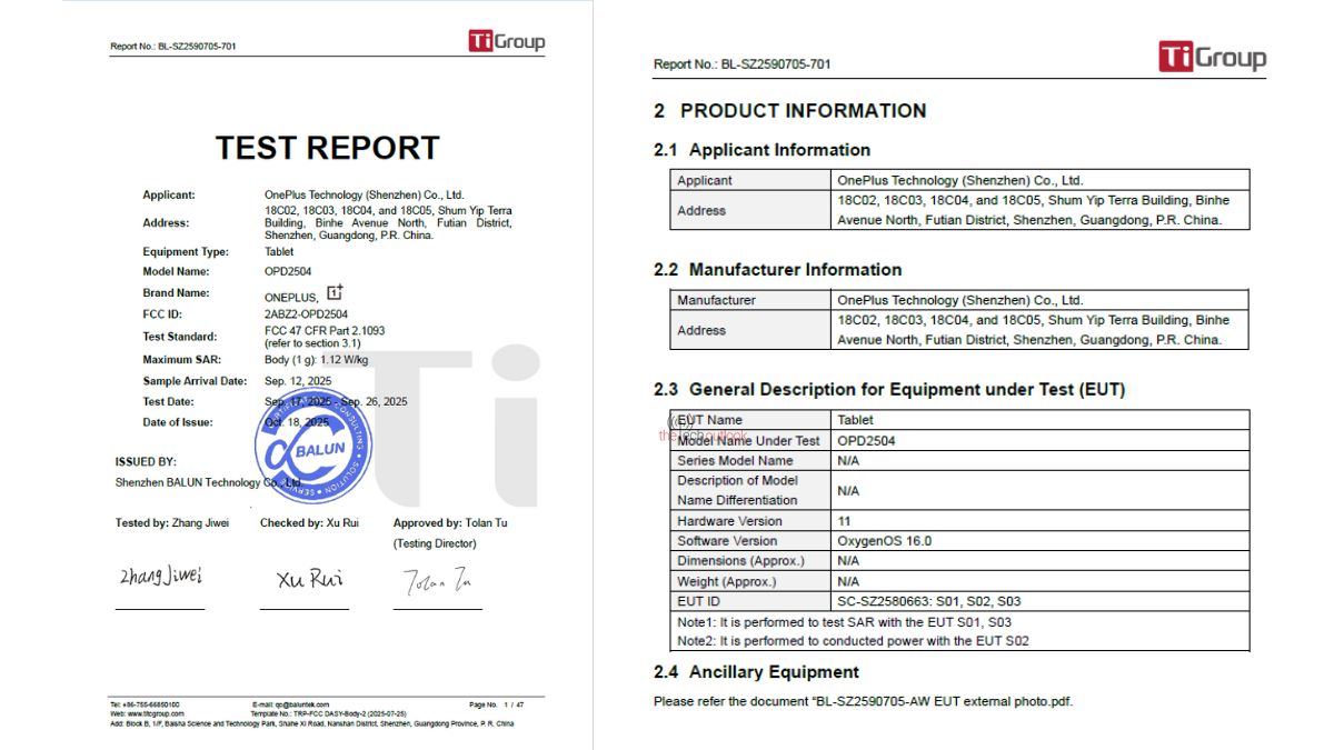 OnePlus Pad Go 2 (OPD2504) Receives the FCC Certification: OxygenOS 16, WiFi 6, 5G Network, and More Revealed