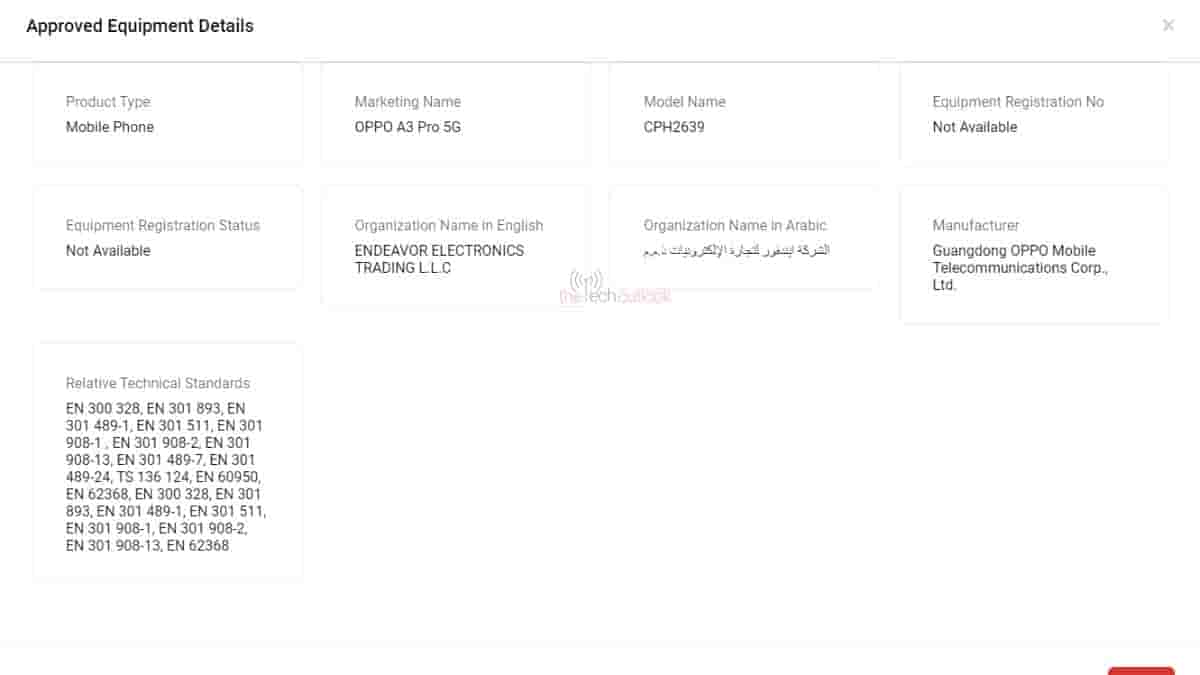 The listing shows the same model number “CPH2639,” and under the marketing name, it is listed as Oppo A3 Pro 5G. However, the equipment registration number is not present on this certification, indicating it is still under process. Apart from this, the TDRA certification doesn’t reveal much about the smartphone in terms of specifications.