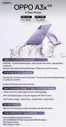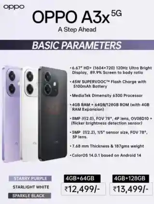 We have seen the leaked specs of the Oppo A3x 5G smartphone earlier also in an exclusive report. Its appearance reaffirms earlier leaked specs. The Oppo A3x 5G smartphone can come with a 6.67-inch HD+ display with a resolution of 1604 x 720 pixels, 120Hz refresh rate, and 1000 nits of peak brightness. It can be powered by the MediaTek Dimensity 6300 octa-core processor and can run Android 14 based ColorOS 14.1. In the camera department, we can see a 32MP main camera on the rear. The front side of the smartphone can boast a 5MP selfie camera. It can be backed by the 5100mAh battery that supports 45W SuperVOOC charging.