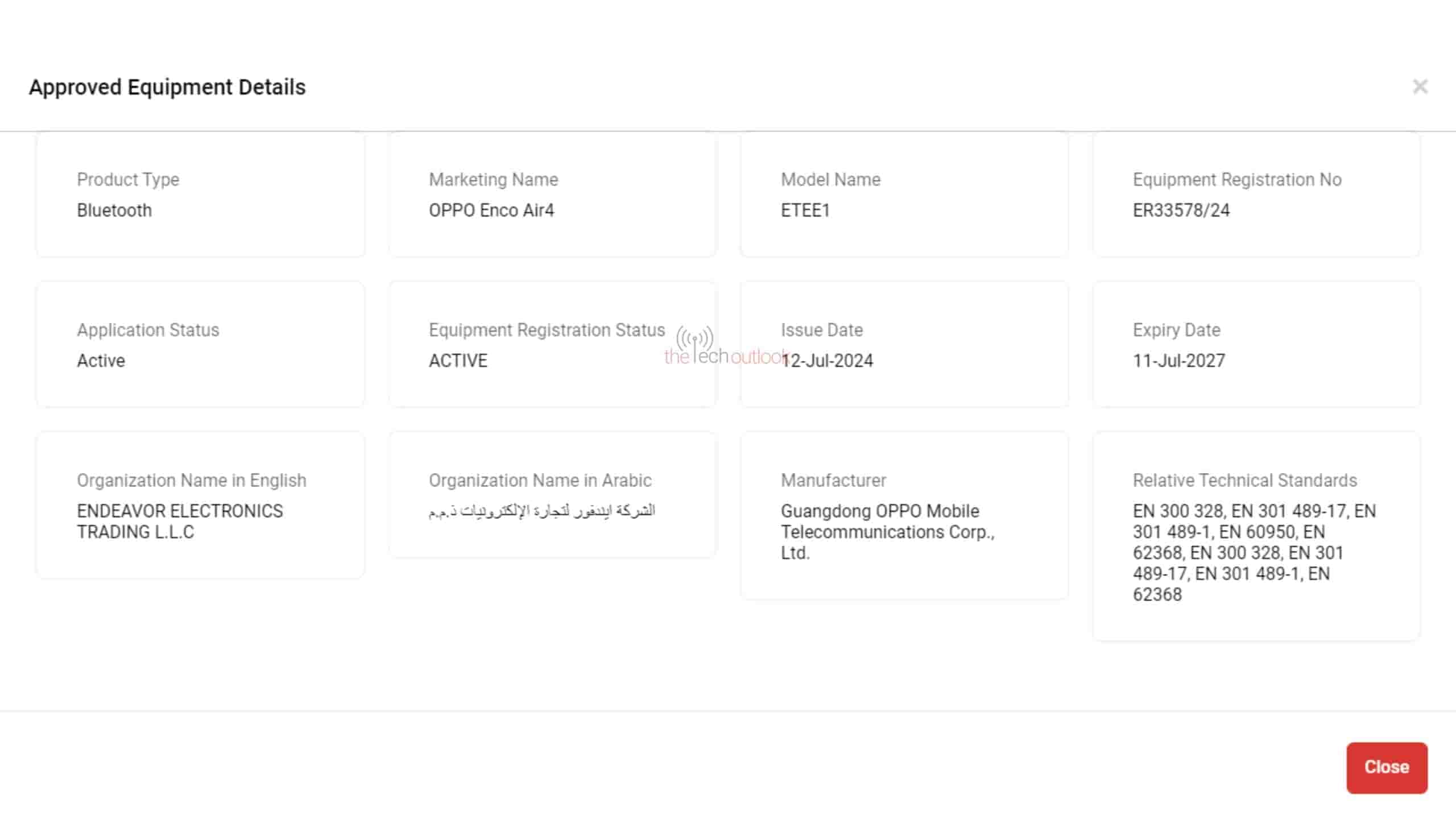 The next gadget listed on the TDRA is the Oppo Enco Air4 with the model number “ETEE1.” The listing does not provide any hardware specifications, but it might be a trimmed-down version of the Oppo Enco Air4 Pro, which was first launched in China and later in Ukraine.