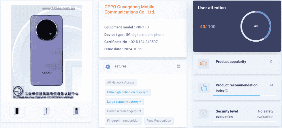 Via the MIIT database, the front and rear images of the OPPO A5 Pro smartphone were shared, revealing design specs such as the curved edge display, projected round camera module with Black interior and Silver lining, and a Purple colorway.