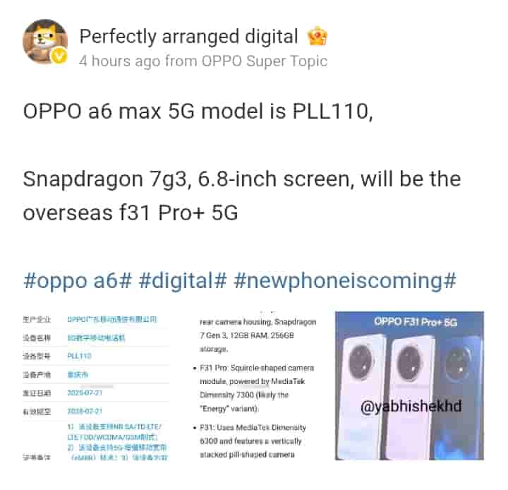 OPPO A6 5G Receives 3C Certification, Revealing 80W Wired Fast Charging; OPPO A6 Max 5G Certified by MIIT Authority; OPPO A6 5G and A6 Max 5G Pointed Out to Hit Global Market as Re-Branded OPPO F31 5G and F31 Pro+ 5G