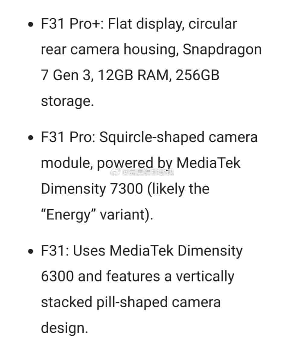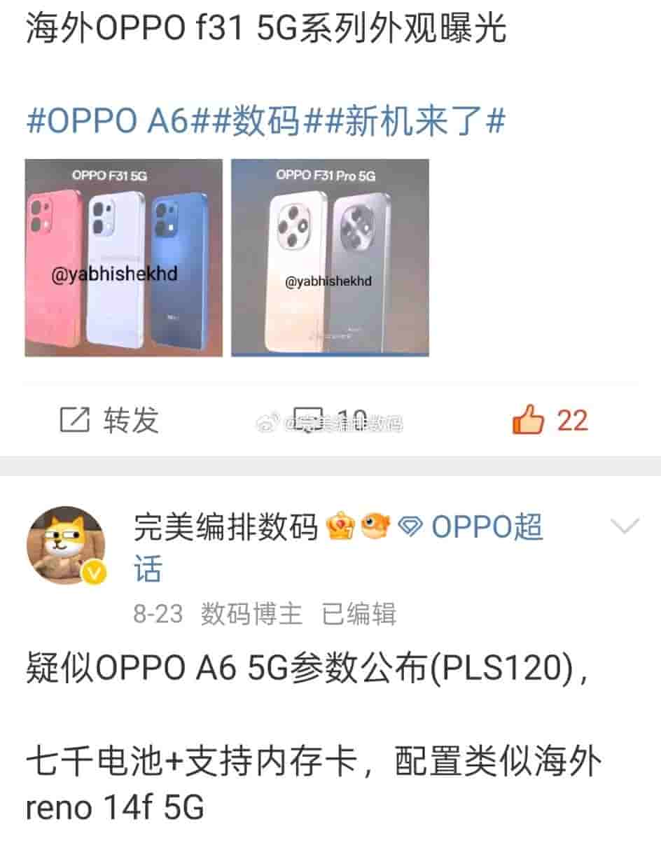 Regarding OPPO’s F31 series, apart from the OPPO F31 5G and OPPO F31 Pro+ 5G models, there is also the OPPO F31 Pro 5G device too. A recent update had also revealed its design renders and key specs, and it has again been re-iterated in the new Weibo update. Notably, the OPPO F31 5G, OPPO F31 Pro 5G, and the OPPO F31 Pro+ 5G smartphones are believed to use the Snapdragon 7 Gen 3, Dimensity 7300, and the Dimensity 6300 chipsets. The earlier update also suggested 7000 mAh battery backup for all of OPPO’s F31 series smartphones, while the standard and pro models are revealed to support 80W wired charging. An IP68/69 rated protection is also being expected on the F31 series models as well. Also to note, the OPPO F31 series launch is expected to take place in the mid-half of September 2025.