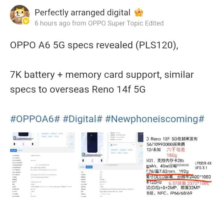 Speaking more, as per the tipster who has shared the update, the upcoming OPPO A6 5G which will be hitting the Chinese market is said to show certain similarities with OPPO’s Reno 14F 5G device that was introduced in the global market. However, there are notable differences too particularly with respect to the battery, dimension, and weight – meaning that the OPPO A6 5G won’t be an entirely re-branded version of the OPPO Reno 14F 5G.