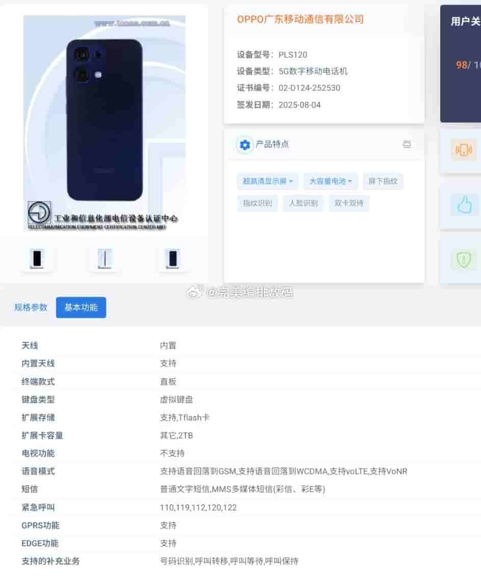 The OPPO smartphone that carries the model number of ‘PLS120′ is revealed to be the upcoming OPPO A6 5G device, and it has received the TENAA certification with the certificate number of ’02-D124-252530’. The device has again been listed as a ‘5G digital mobile phone’, and an ultra high definition display, large capacity battery, under display fingerprint scanner, face recognition, and dual SIM dual standby are noted as its key features.