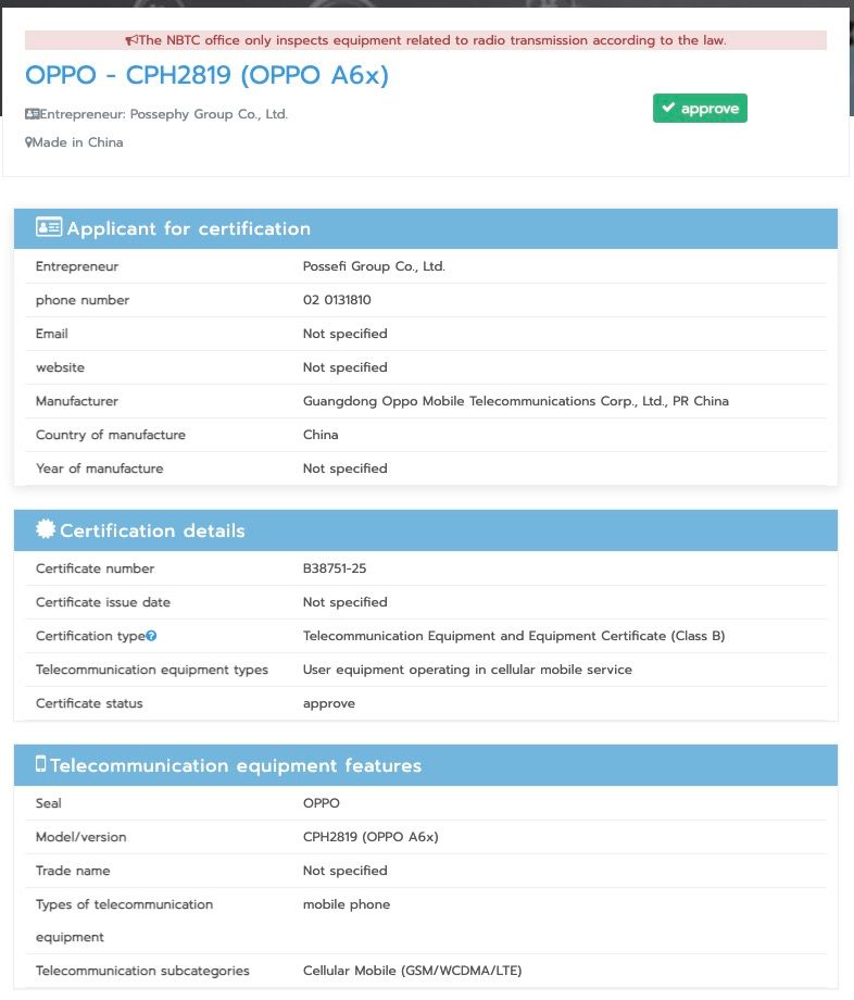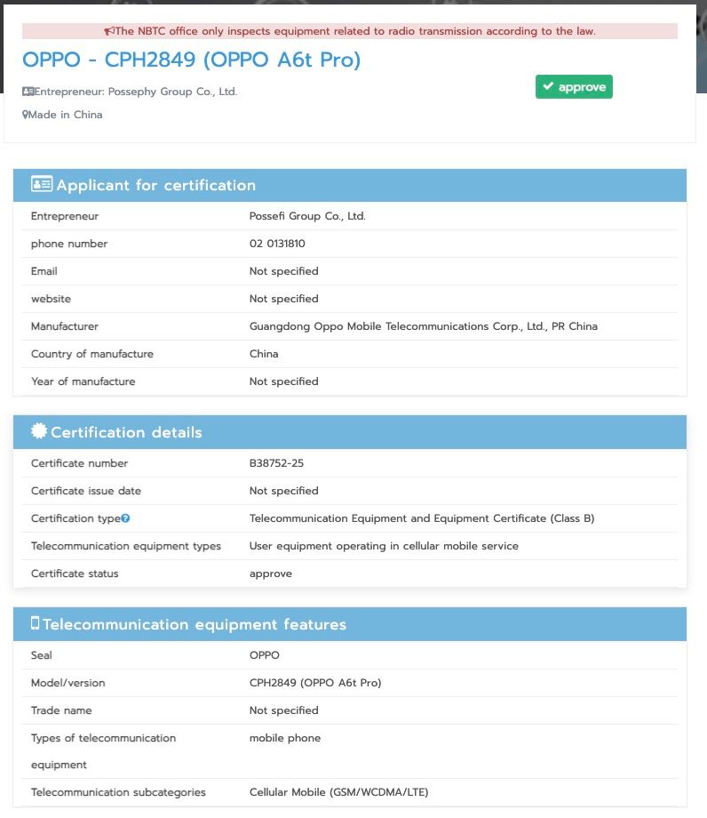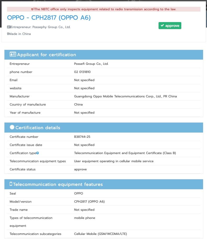 Oppo A6, Oppo A6t Pro & Oppo A6x: Spotted on NBTC database