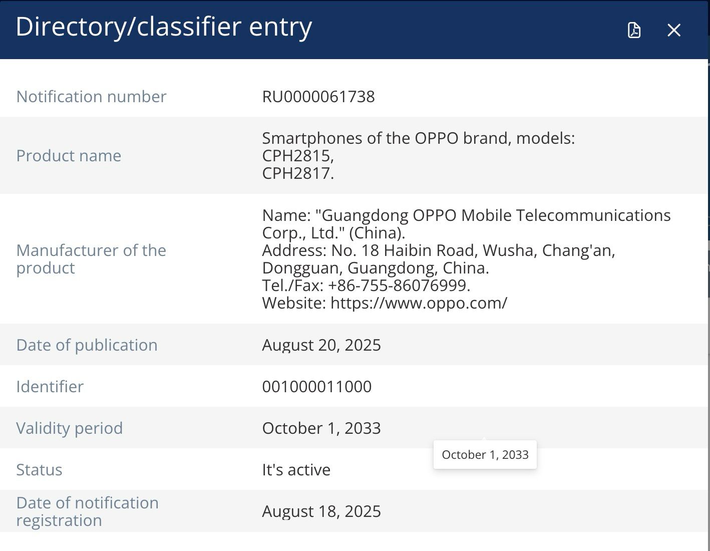 Oppo A6 and a new Oppo smartphone with model number CPH2815 have made their appearance on the European EEC certification website. The certification comes with a validity period of October 1, 2033. It confirms the launch of the devices in the European market.