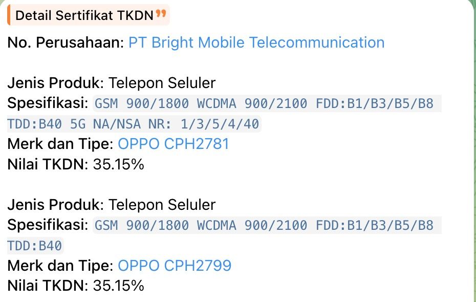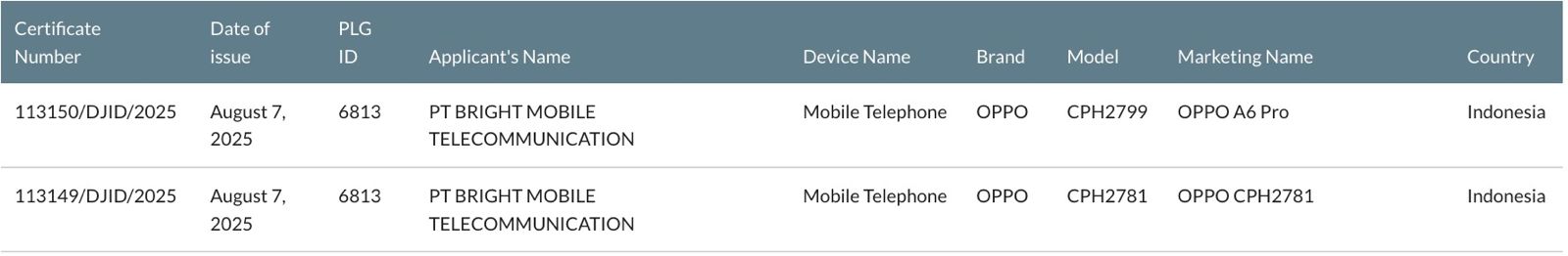 On the SDPPI database of Indonesia, both the OPPO A6 Pro 4G and the OPPO A6 Pro 5G smartphones with the same model numbers of ‘CPH2799’ and ‘CPH2781’ have been spotted, and these are certified with certificate numbers of ‘113150/DJID/2025’ and ‘113149/DJID/2025’, respectively. They have been listed under the PLD ID of ‘6813’, and the moniker of the OPPO A6 Pro (4G) has been mentioned. Regarding their TKDN listings, 35.15% TKDN value has been attributed to the two, and it is via the TKDN database that the ‘CPH2799’ model was revealed to be the OPPO A6 Pro 4G model supporting 2G/3G/4G network connectivity.