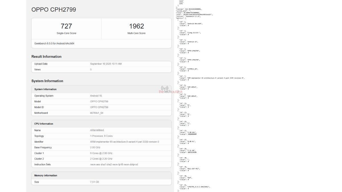 As per its Geekbench listing, the OPPO A6 Pro 4G smartphone which carries the model number of ‘CPH2799’ has attained 727 points on the single-core test and 1962 points on the multi-core test. An octa-core chip with a primary clock speed of 2.20GHz is revealed to power the device, and it is integrated with the ARM Mali G57 MC2 GPU. The Android 15 operating system will also be offered on it out of the box, and it will have an 8GB RAM option too. Based on the chip details, the OPPO A6 Pro 4G could be using either the Helio G100 or the Helio G200 chipsets from MediaTek as both of them are re-branded versions (of the 2022-released Helio G99 chip).
