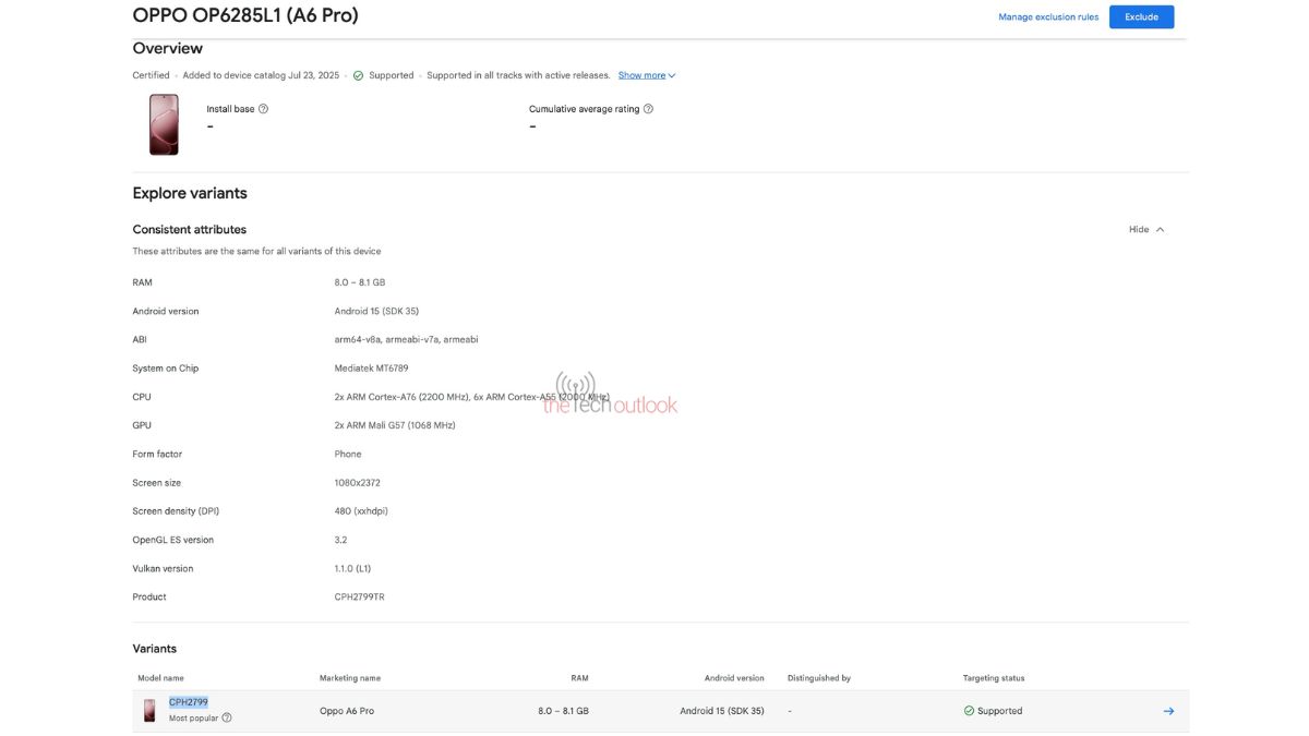 Oppo A6 Pro 4G smartphone has been spotted on various certifications- TKDN, EEC, SDPPI, Import & Export, and Geekbench. And today, our team at The Tech Outlook has spotted this variant on the Google Play Console database.