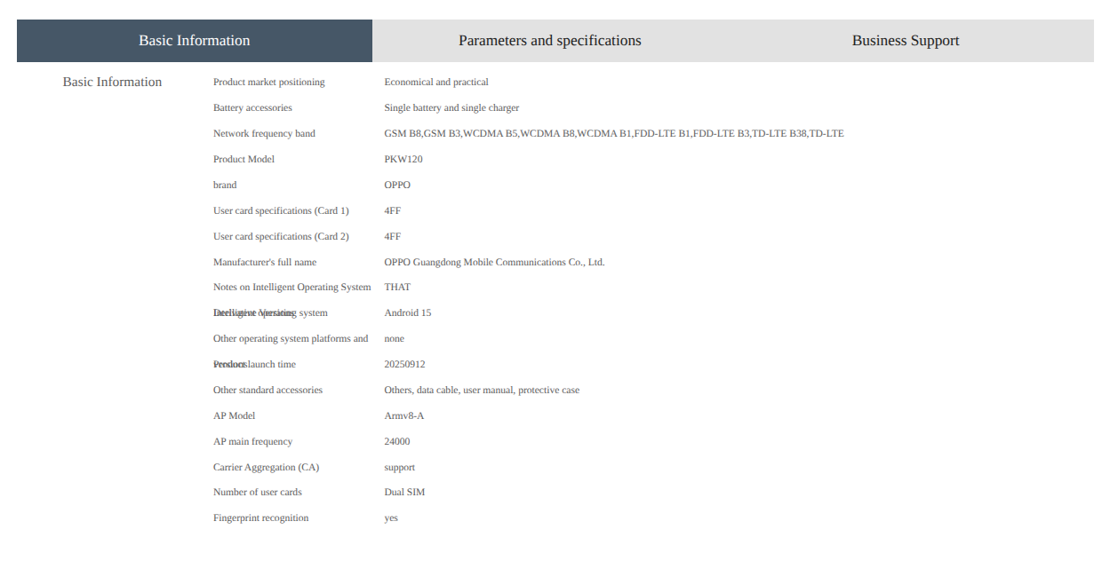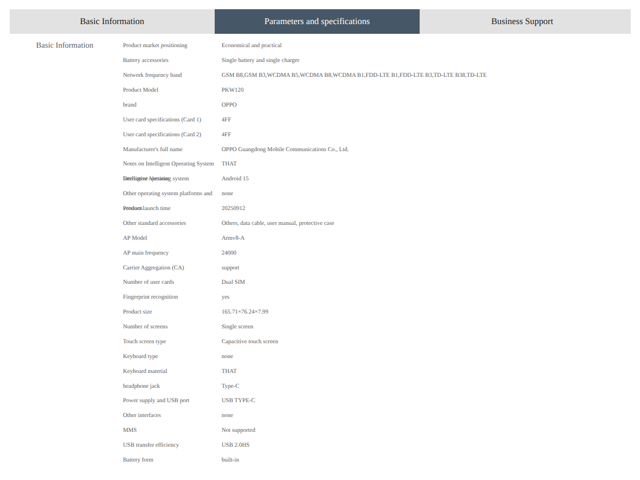 The OPPO A6i 5G smartphone which carries the model number of ‘PKW120’ is revealed to arrive in China next week on the 12th of September 2025, and it will be made available in three storage options (of 6GB/128GB, 8GB/128GB, 8GB/256GB) and two color choices (of Midnight Black, Cloudy White). As indicated by its moniker, it will be supporting 2G/3G/4G/5G network and will offer the Android 15-based operating system out of the box. The product size has been noted as 165.71 x 76.24 x 7.99 mm, and it will be featuring other key specs like dual SIM, fingerprint scanner, USB type-C port (for charging and audio), and USB 2.0 connectivity.