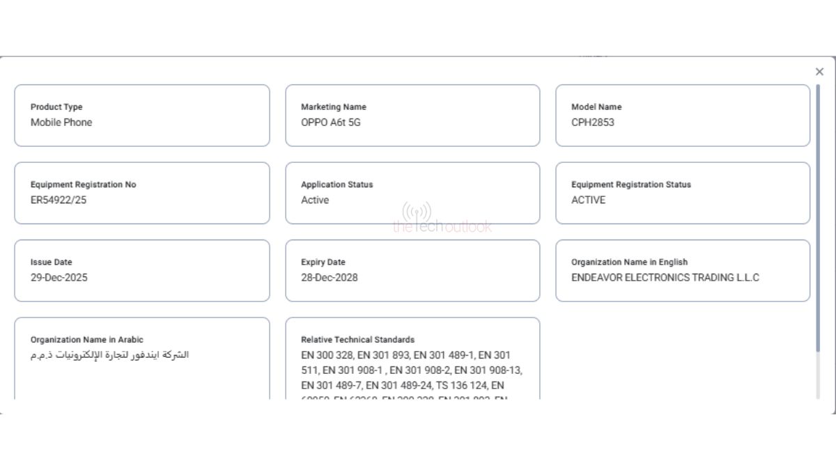 The Oppo A6t 5G (CPH2853) has now been spotted on the UAE’s TDRA certification website with equipment registration number ERS-4922/25. The issue date of this certification is 29-Dec-2025, and the expiry date is 28-Dec-2028.