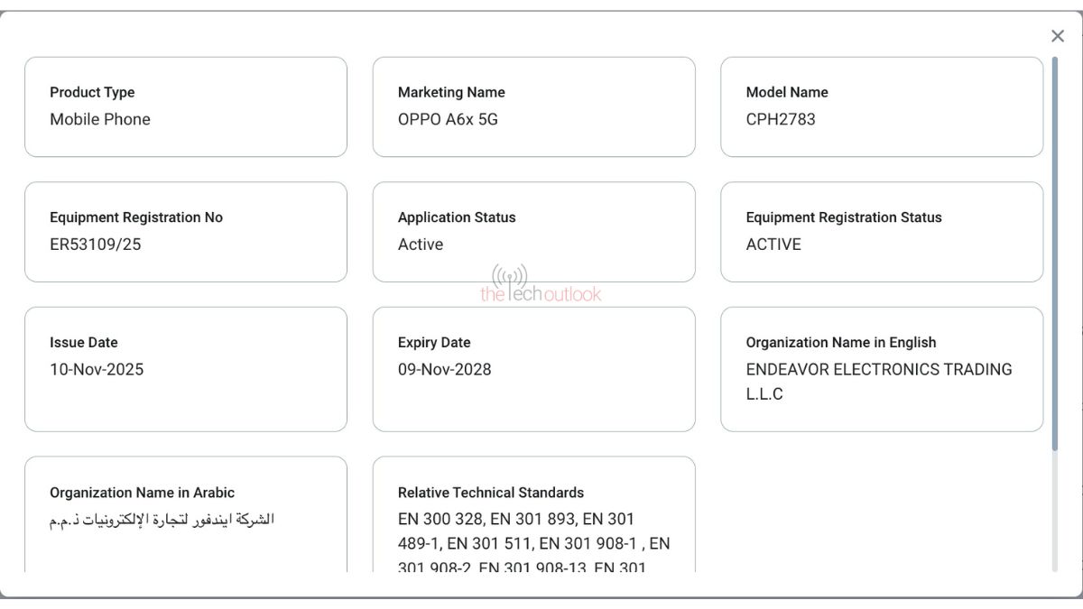 The Tech Outlook has spotted the Oppo A6x 5G smartphone on the TDRA certification website with model number CPH2783. It comes with equipment registration number ER53109/25, and the certification is valid till 9 November 2028.