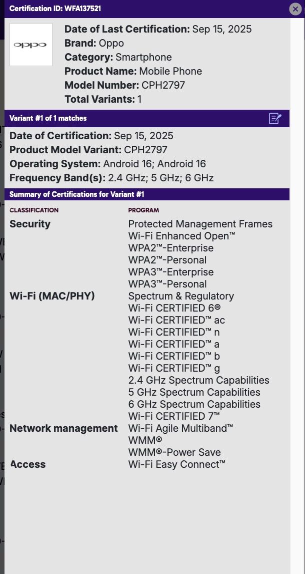 On the WiFi Alliance certification database, the OPPO smartphone that carries the model number of ‘CPH2797’ has been listed with the certification ID – ‘WFA137521’, and it is pointed out to feature specs like Android 16 OS, WiFi 7 with 2.4 GHz + 5 GHz + 6 GHz frequency bands, and WPA2/WPA3 Enterprise/Personal security.
