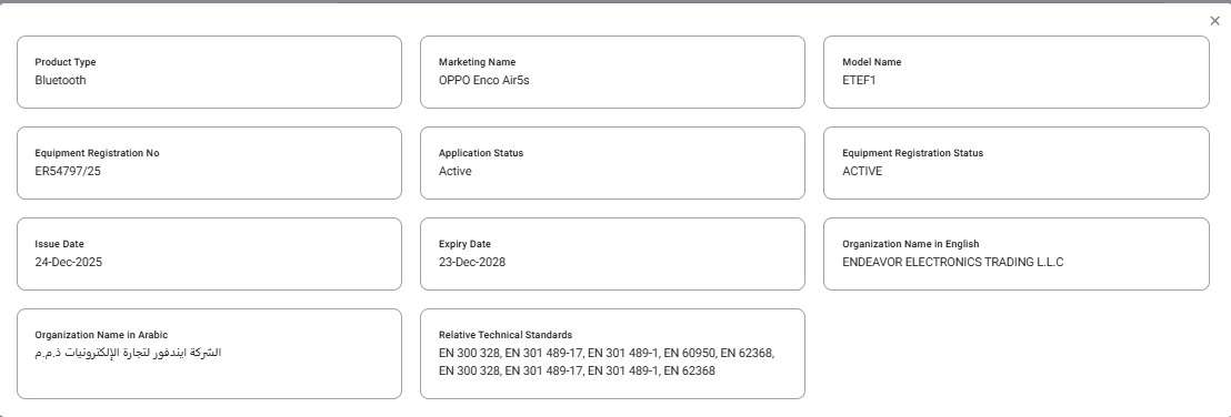 The database confirms that this is the Oppo Enco Air 5s earbuds. It was spotted with the equipment registration number ER54797/25 and is categorised as a Bluetooth product. The certification was issued on 24 December 2025, and it expires on 23 December 2028. The listing confirms that the earbuds will soon launch in the UAE market.