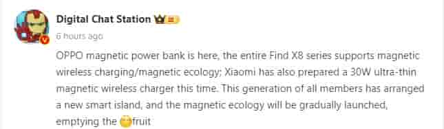 Further, he also mentioned that the entire Oppo Find X8 series will support magnetic wireless charging/ magnetic ecology. The tipster also shared that Oppo and Xiaomi have also working on a 30W ultra-thin magnetic wireless charger. Though the Xiaomi device with which this charger will be accompanied is not revealed we may see this charger with the rumored Xiaomi 15 series. Readers are advised to wait for further updates in order to learn more about this Xiaomi Charer and Oppo power bank.