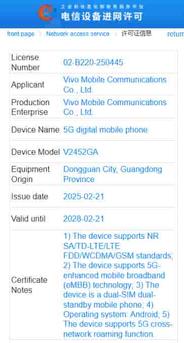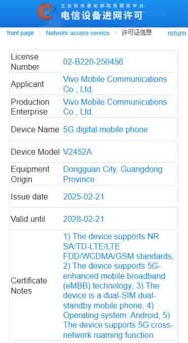 iQOO Z10 Turbo (V2452A) and its alleged variant (V2452GA) have also made their appearance on the MIIT database. Both the devices are revealed to support NR SA/TD-LTE/LTE FDD/WCDMA/ GSM standards, support 5G eMBB technology, and are dual SIM dual standby mobile phones.