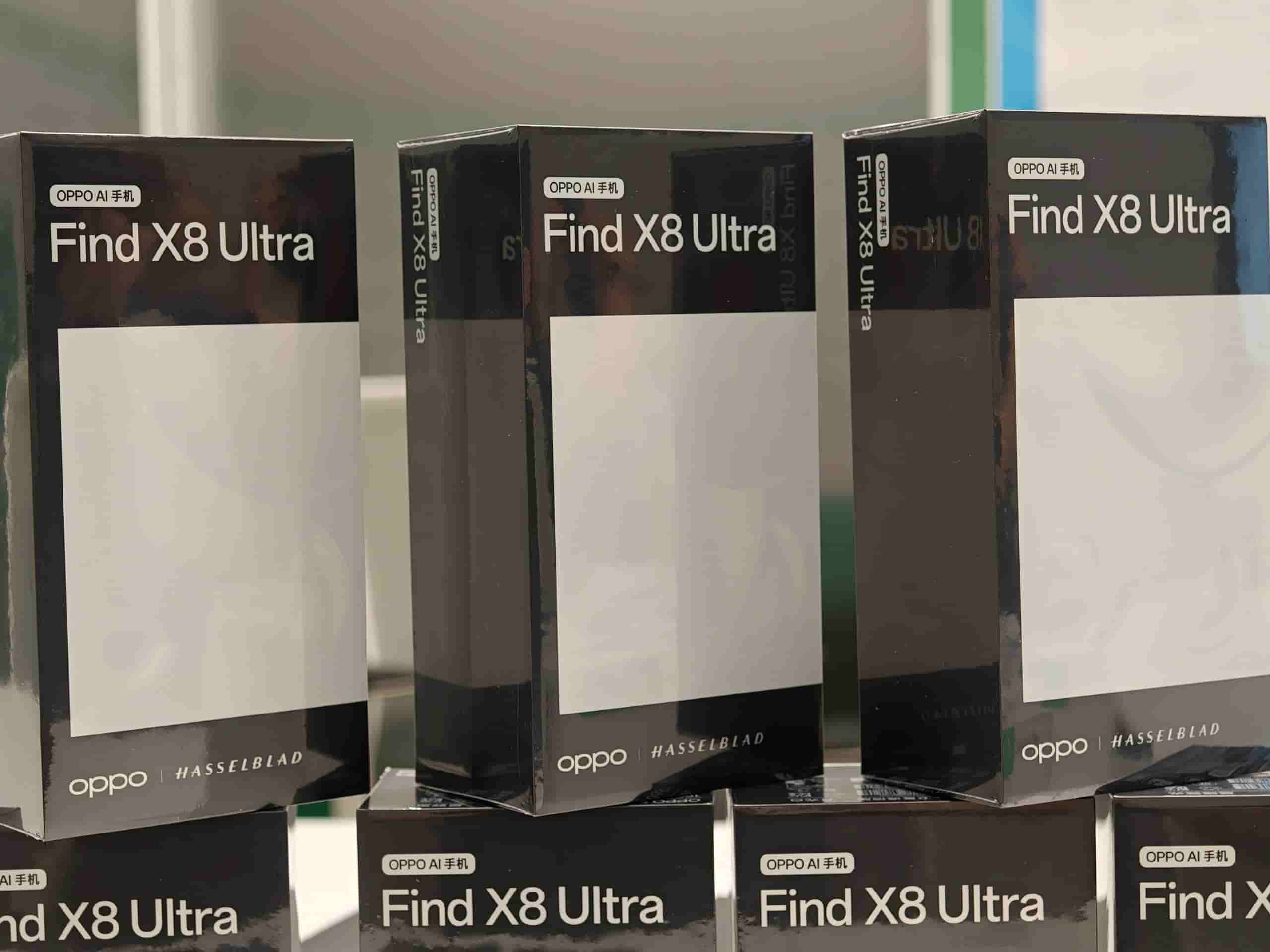 The boxes of all three devices feature the device name in the upper left corner, with number 8 printed in the lower left corner, while the Hasselblad logo is present at the bottom. Oppo Find X8s box is in a greyish color, Find X8s+ box is in a bluish color, while the Ultra model box is in black color.