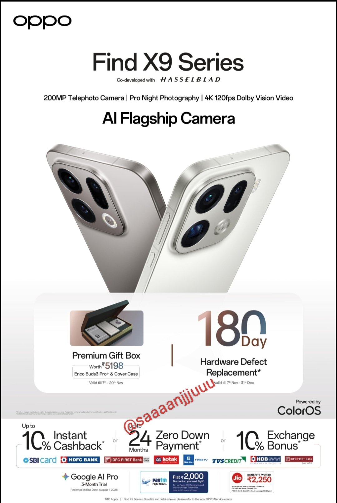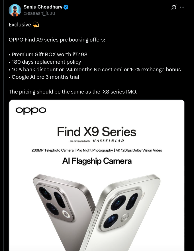 This update comes from the tipster @saaaanjjjuuu and as per details shared, Indian customers pre-booking the latest OPPO Find X9 series smartphones will likely be eligible to avail exciting deals like a premium gift box worth INR 5,198 (OPPO Enco Buds3 Pro+ and cover case, validity from 7th November ~ 20th November 2025), 180 days replacement policy (validity from 7th November ~ 31st December 2025), 10% bank discount, 24 months no cost EMI, 10% exchange bonus, and Google AI Pro for three months (trial*). Additionally, the same tipster also notes that OPPO’s Find X9 series models may be offered at the same price as that of the previous OPPO Find X8 series in India (OPPO Find X8 and OPPO Find X8 Pro were offered last year at respective starting prices of INR 69,999 and INR 99,999).
