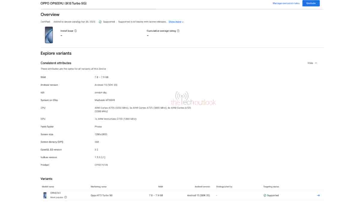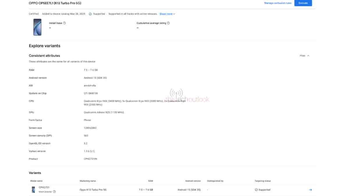 On the Google Play Console database, OPPO’s K13 Turbo and K13 Turbo Pro smartphone models carrying the respective model numbers of ‘CPH2761’ and ‘CPH2731’ have been listed, and these two are revealed to be the global/Indian variants. It is the 8GB RAM variants of the two devices that are listed, and they are revealed with similar specs such as the Android 15 OS and 1280 x 2800 pixel display with 560 DPI screen density. In terms of their processors, the standard and pro models are revealed to use MediaTek’s Dimensity 8450 (integrated with ARM Immortalis G720 GPU) and Qualcomm’s Snapdragon 8s Gen 4 (integrated with Adreno 825 GPU) chipsets respectively.