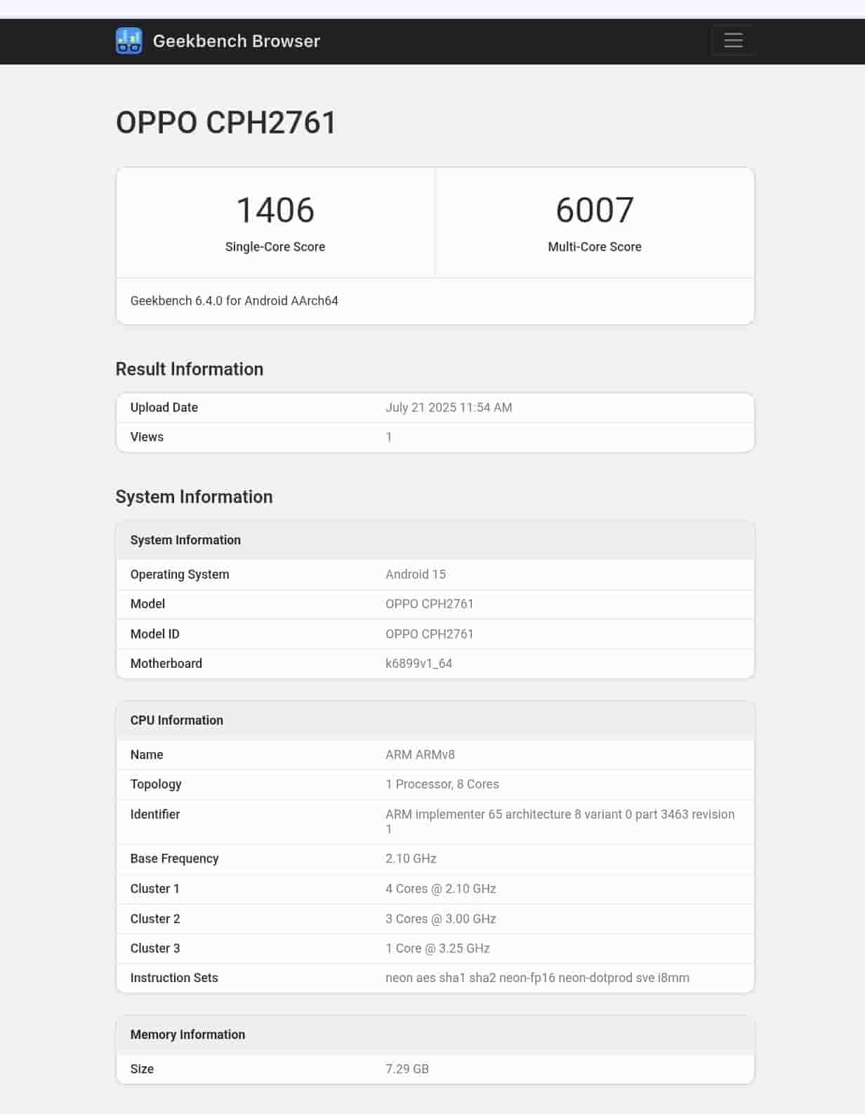 About their Geekbench listings, again with the same model numbers, the OPPO K13 Turbo (CPH2761) and OPPO K13 Turbo Pro (CPH2731) devices have been listed on Geekbench. The standard model has achieved single-core and multi-core scores of 1406 points and 6007 points respectively, whereas the pro model attained 2117 points and 6649 points respectively on the single-core and multi-core tests. The chip details of OPPO’s K13 Turbo Pro is the same as mentioned above, however the OPPO K13 Turbo’s Geekbench listing mentions it to use the same MediaTek Dimensity 8450 chip – but integrated with the ARM Mali-G720 MC7 GPU. Additionally, the global/Indian variant of the OPPO K13 Turbo Pro device is also revealed to offer a 12GB RAM option too.
