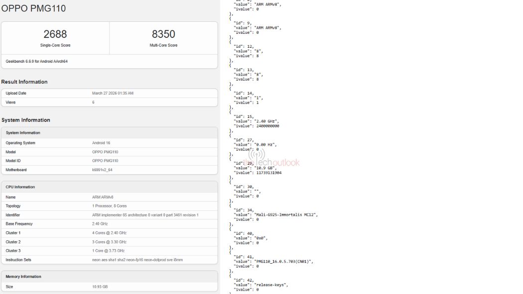 Speaking more, the OPPO K15 Pro+ smartphone bearing the model number of ‘PMG110’ has also been spotted on the Geekbench database. As per the listing, the device is revealed to feature an octa-core processor with a prime core clocked at 3.73GHz, three performance cores at 3.30GHz, and four efficiency cores at 2.40GHz. It has been listed with the Android 16 operating system (PMG110_16.0.5.703(CN01)) and 12GB RAM. From the source code, the device is also pointed out to equip the Mali-G925-Immortalis MC12 GPU, and based on these details, it is suggested to be powered by MediaTek’s Dimensity 9500s chipset. In terms of performance, it has achieved 2688 points and 8350 points respectively on the single-core and multi-core tests.