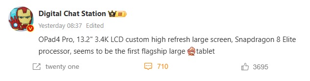 Now coming to the tipped key specs of the device, as per what has been shared by tipster Digital Chat Station, OPPO’s Pad 4 Pro is expected to arrive with Qualcomm’s Snapdragon 8 Elite chip onboard, and it is further pointed out to be the 8-core version, unlike the recently debuted Find N5 foldable that came with the Snapdragon 8 Elite 7-core version chip.