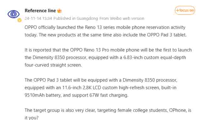 Speaking more, the OPPO Reno 13 Pro is pointed out as the first smartphone to launch with MediaTek’s Dimensity 8350 chip onboard, and is suggested to feature a 6.83″ custom equal-depth micro-quad-curved straight display screen. OPPO’s Pad 3 tablet is also mentioned to use the same MediaTek Dimensity 8350 processor, and offer specs such as a 11.6″ LCD display with 2.8K resolution and custom high-refresh rate, 9510 mAh battery backup, and 67W wired fast charge support. Also to add, the target audience is expected to be female college students as per what has been revealed.