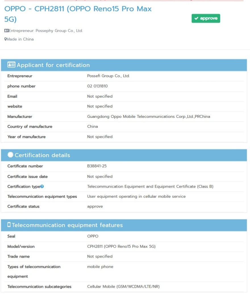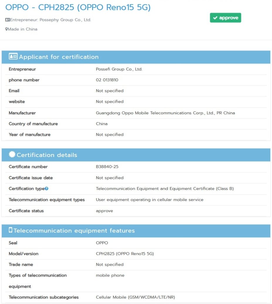 The OPPO Reno 15 5G and the OPPO Reno 15 Pro Max 5G smartphones have received the NBTC certification with the respective certificate numbers of ‘B38840-25’ and ‘B38841-25’, and both of them are categorized as ‘Mobile Phones’. Their monikers are listed on the certification database, and both of them are again suggested to support 2G/3G/4G/5G network connectivity. Also, via the NBTC listing, their launch in Thailand has been confirmed.