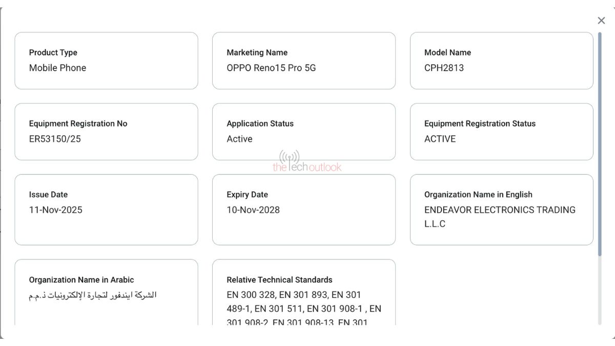 Oppo is going to launch the next Reno 15 series in its home market, China, for which the launch date has already been announced as November 17th, 2025. Along with this, rumours have already started circulating about the Reno 15 Series’ global launch, even before the China debut. Adding to this, we have now spotted the Oppo Reno 15 Pro 5G on the UAE’s TDRA certification, India’s BIS, the e-SIM compatibility site, import and export website, and EEC certification.
