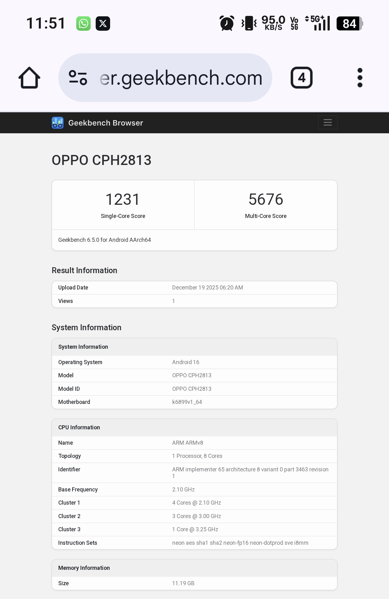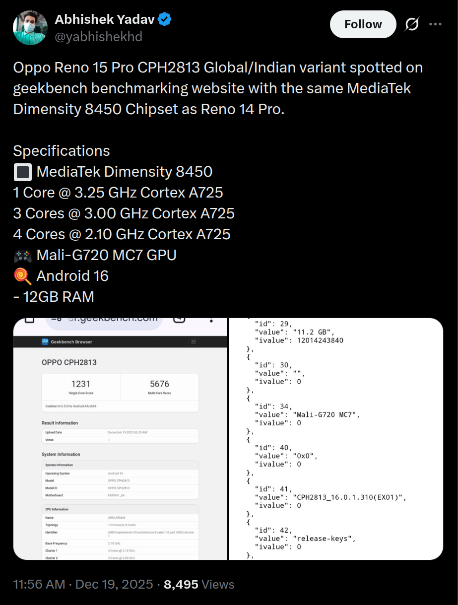 As per the Geekbench database, the global/Indian variant of the OPPO Reno 15 Pro smartphone with the model number of ‘CPH2813’ has attained single-core and multi-core scores of 1231 points and 5676 points respectively, and just like its Chinese counterpart and predecessor, it is pointed out to come equipped with MediaTek’s Dimensity 8450 chipset (3.25GHz). Other revealed specs include the ARM Mali-G720 MC7 GPU, Android 16 OS, and 12GB RAM option.