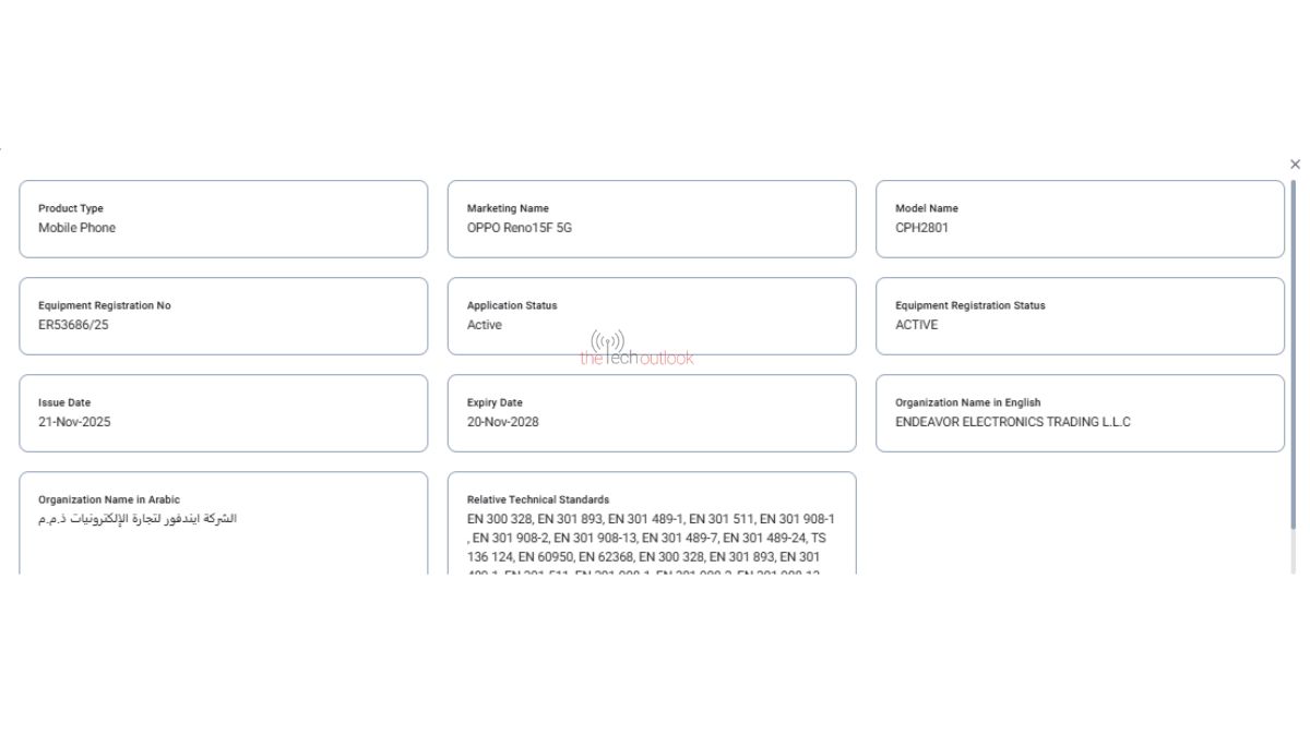 The OPPO Reno 15F 5G smartphone carrying the model number of ‘CPH2801’ has received the TDRA certification with the equipment registration number of ‘ER53686/25’, and the device is categorized as a ‘Mobile Phone’. Its TDRA certification validity will be till the 20th of November 2028, and the TDRA listing has confirmed its arrival in the UAE market.