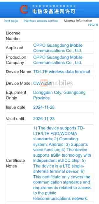 The database reveals that the Oppo smartwatch will support TD-LTE/LTE FDD/WCDMA connectivity options. It will arrive as an LTE single antenna terminal device and will support eSIM technology with an independent eUICC chip. The operating system mentioned is Android.