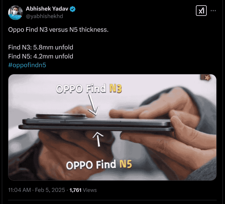 As per the latest update (received via @yabhishekhd), it has been revealed that the upcoming Find N5 foldable flagship smartphone from OPPO would possibly be featuring a thickness of 4.2mm when unfolded, while the previous Find N3 has an unfolded thickness of 5.8mm. The Find N5 now has seemingly reduced its thickness by 1.6mm when compared with its predecessor, and the new slimmer design is very much evidently portrayed in the shared comparison image.
