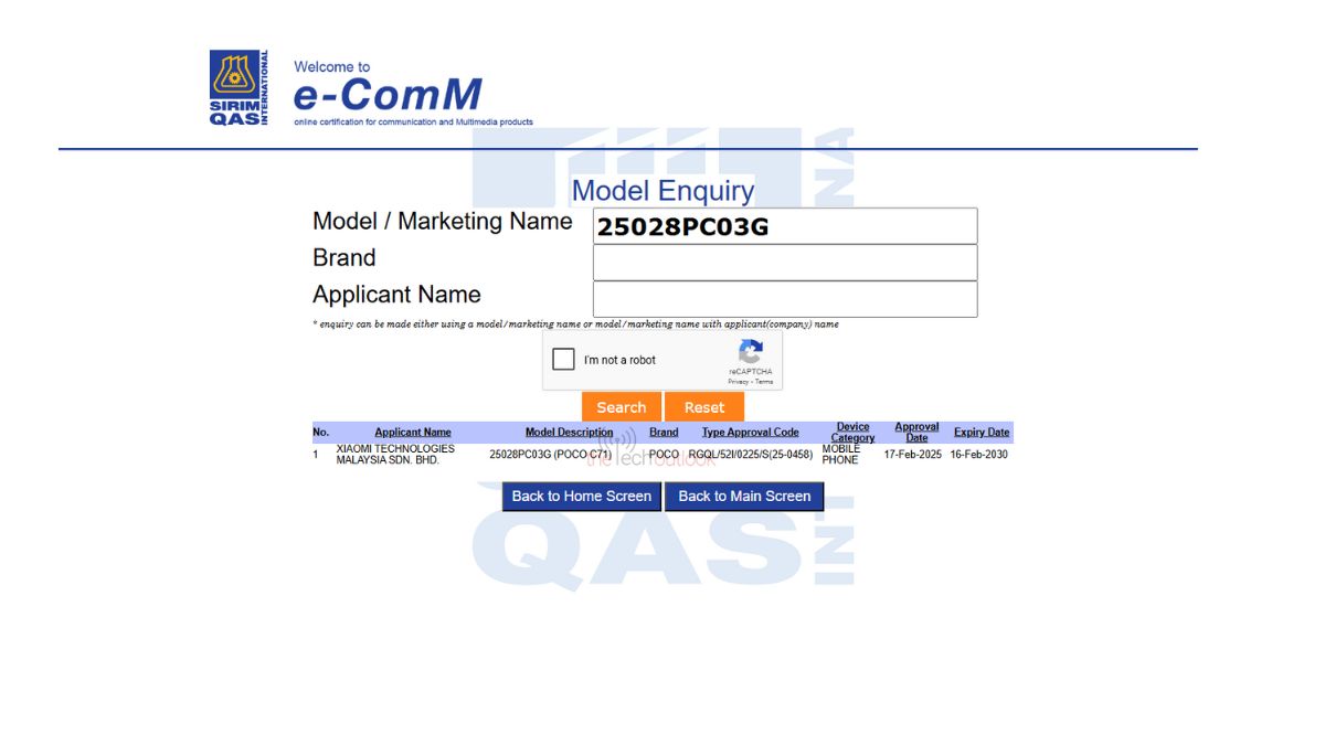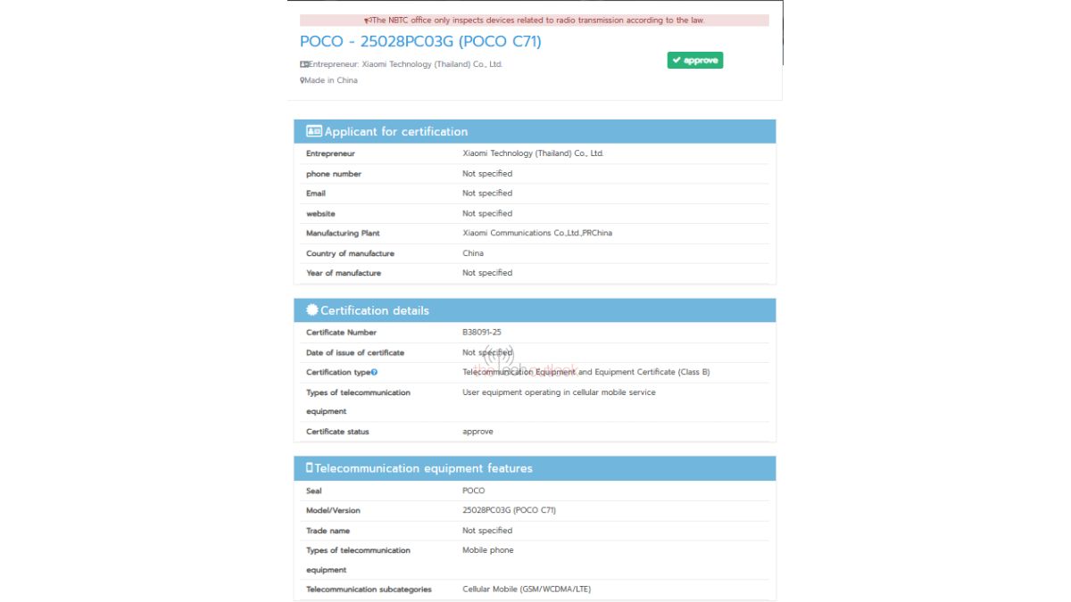 The POCO C71 smartphone global model which bears the model number of ‘25028PC03G’ has appeared on the SIRIM and NBTC databases. The SIRIM authority has certified the device with the type approval code of ‘RGQL/52I’/0225/S(25-0458)’ and it has been categorized as a ‘Mobile Phone’. To add, its moniker is mentioned on the SIRIM database and the certification will be valid only till the 16th of February 2030.