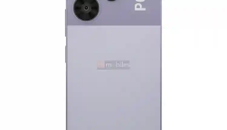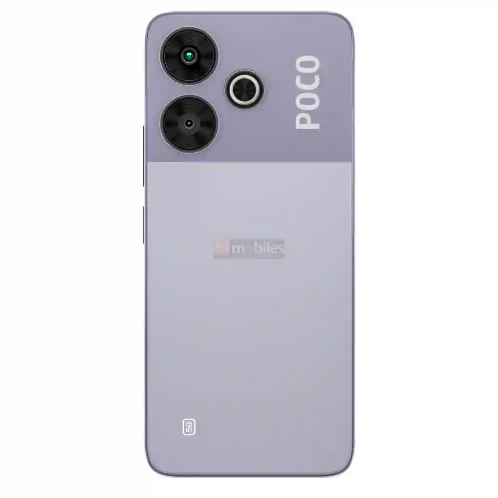 The POCO M6+ 5G leaked smartphone renders show the smartphone in three color options Purple, Black, and Silver. The rear side of the smartphone shows a similar camera setup as the POCO M6 though the LED flash ring is more prominent in it. The front side of the smartphone shows a flat centrally placed punch-hole cutout display with equal bezels and a sizable chin. The frame looks flat and the volume keys and power button are on the phone’s right side.