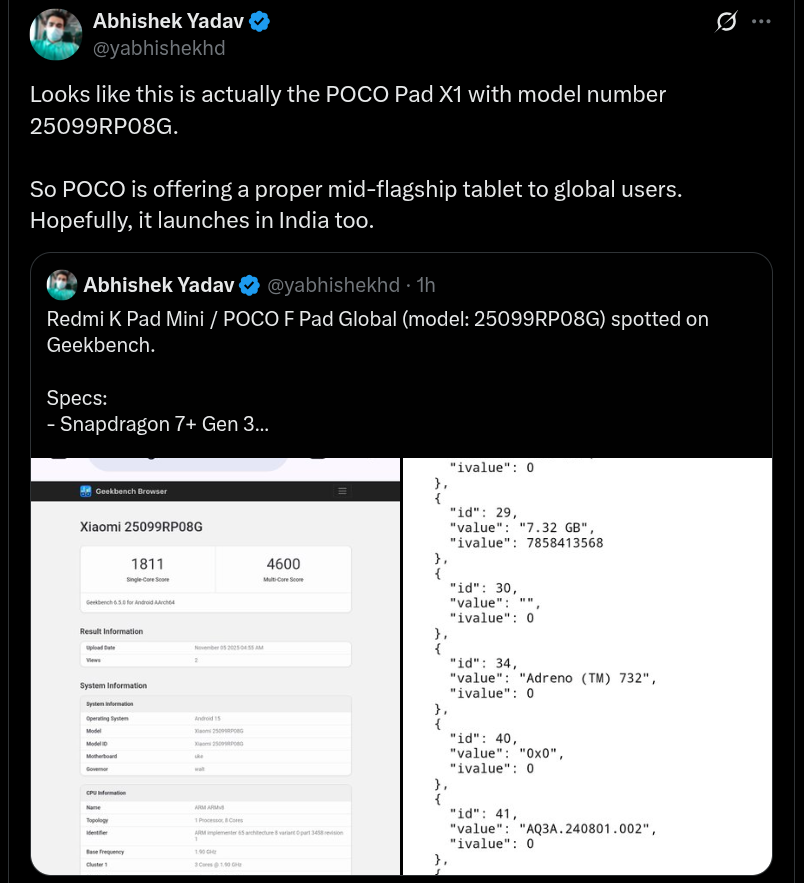 POCO’s Pad X1 tablet is revealed to carry the model number of ‘25099RP08G’ and it has attained respective single-core and multi-core performance scores of 1811 points and 4600 points. As per its benchmark listing, the device is going to use Qualcomm’s Snapdragon 7+ Gen 3 chip, integrated with the Adreno 732 GPU, and it will come with the Android 15 operating system out of the box. An 8GB RAM variant can also be expected for the device.