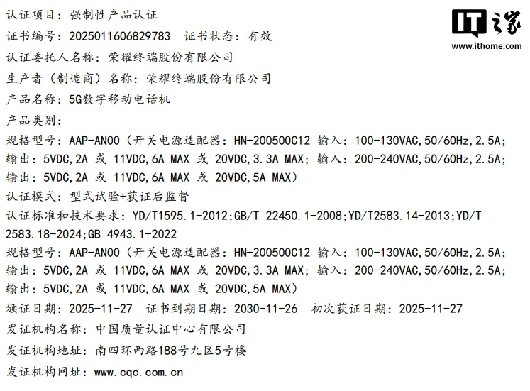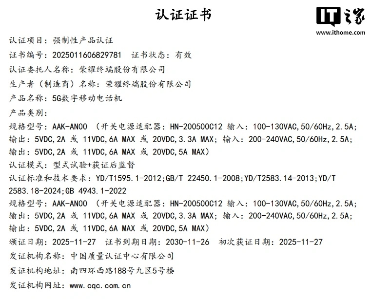 The Honor smartphone models with the model numbers of ‘AAK-AN00’ and ‘AAP-AN00’ have been spotted on the 3C certification database, and these two have received the certification with the respective certificate numbers of ‘2025011606829781’ and ‘2025011606829783’. Both these devices have been categorized as ‘5G digital mobiles phones’, and they are revealed to support up to 100W wired fast charging. To add, a charging adapter with the model number of ‘HN-200500C12’ has also been listed along with the two smartphones. Regarding the certification validity, it is mentioned to be till the 26th of November 2030.