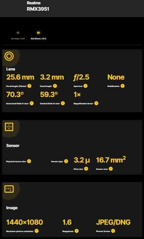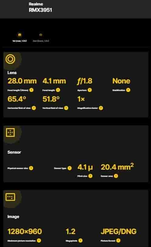 Realme RMX3951 was also spotted on the Camera FV5 database. It is revealed that the primary camera will sport f/1.8 aperture, 4.1mm focal length, and an image resolution of 1280×960 pixels. This suggests that it might sport a 50MP main rear camera. The selfie camera will arrive with f/2.5 aperture, 3.2mm focal length, and an image resolution of 1440×1080 pixels.