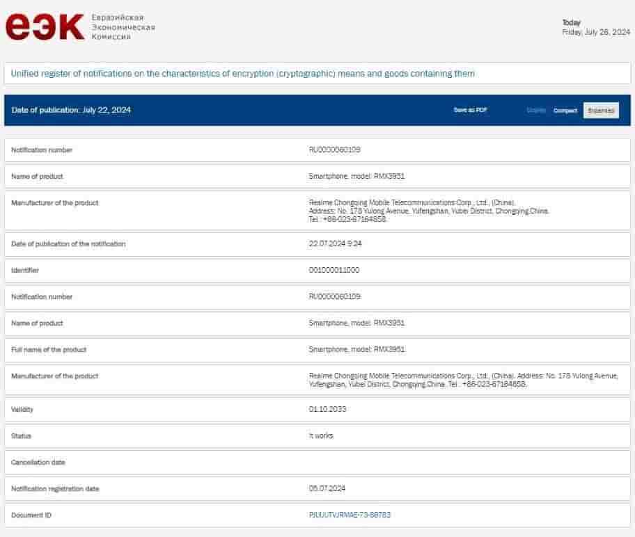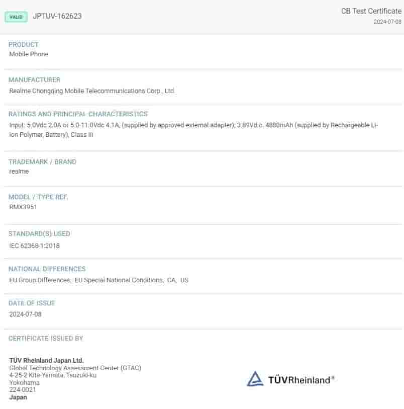Other than NBTC, this smartphone was spotted on a few other certification websites. Model number RMX3951 made its appearance on BIS, EEC, and TUV certification websites.